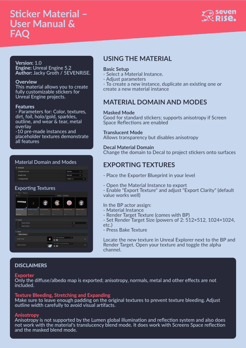 A fully customizable material system for Unreal Engine 5.2 that turns any texture into a sticker with support for outlines, foil effects, wear-and-tear, transparency, and more. The toolkit includes 10 preset instances, a demo scene and a custom export Blueprint that allows baking stickers into textures for use outside of Unreal.